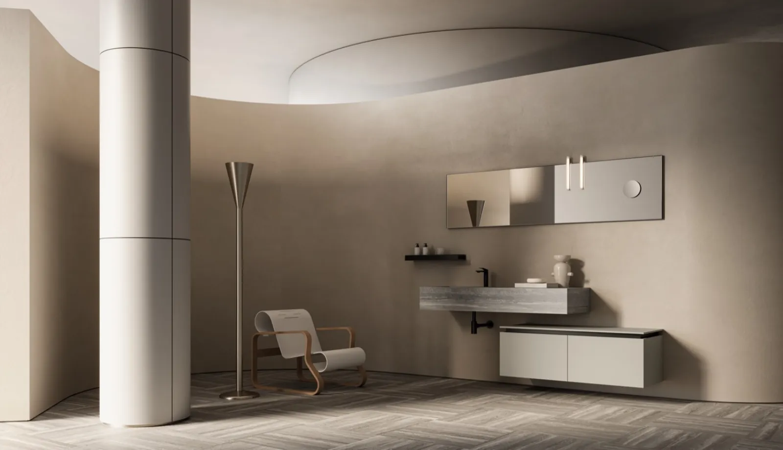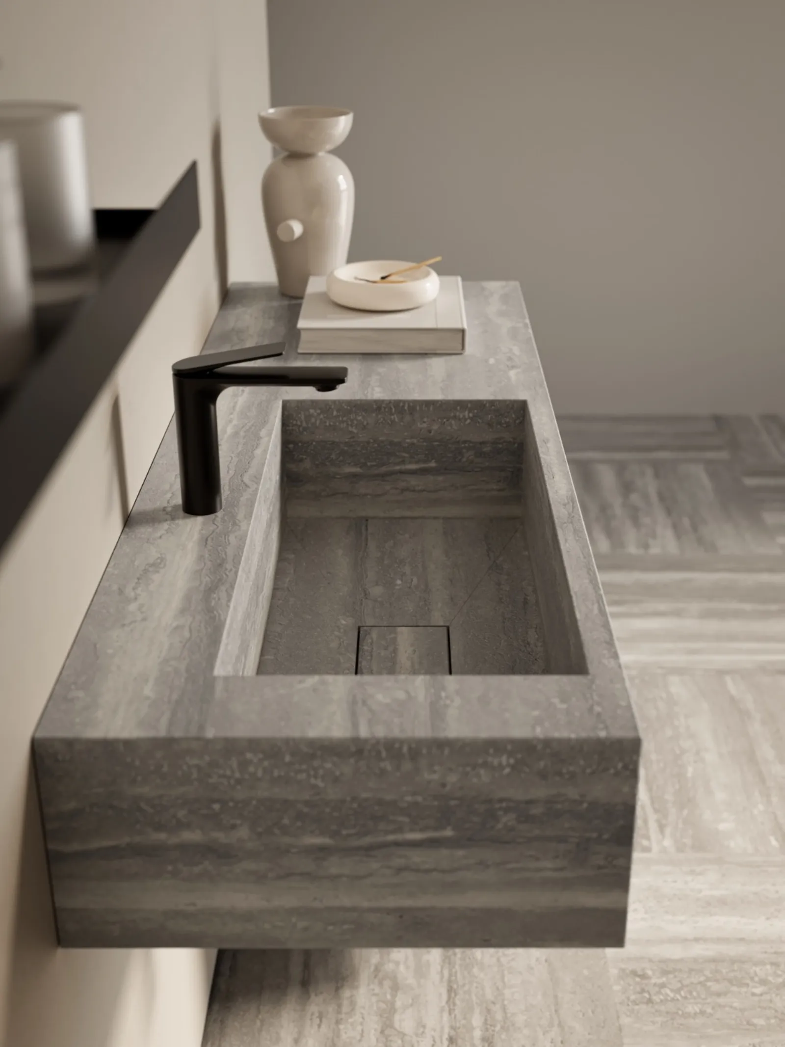 mobili bagno sospesi in polimerico della firma Puntotre: clicca e scopri l'arredo bagno moderno Alto 02 per il tuo bagno.